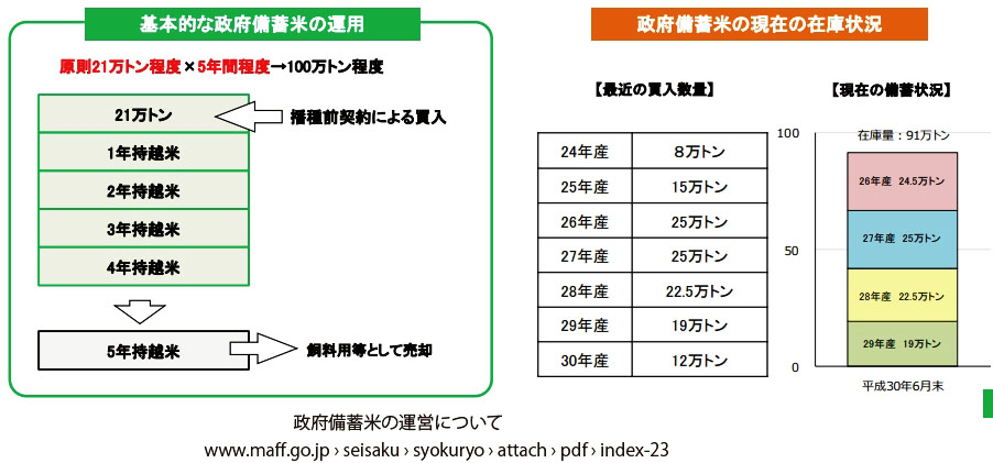 備蓄の年数 最長で5年間保管された米(古米、古古米など)が混在する。