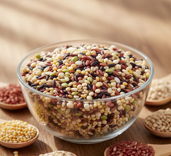 雑穀米の多様な穀物が混ざり合い、色鮮やかで栄養豊かな様子