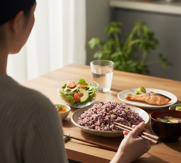 雑穀米を食事に取り入れているシーンで、健康的なライフスタイルを象徴するイメージ