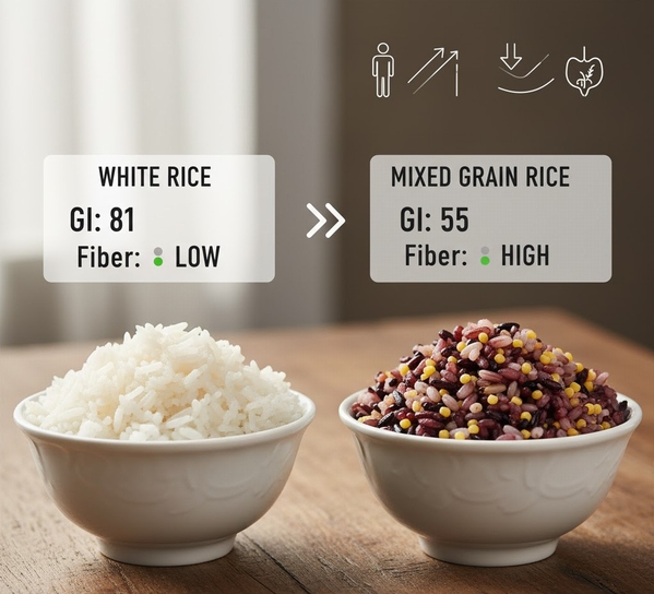 雑穀米と白米が並べられ、その栄養素やGI値の違いを対比的に示すイメージ