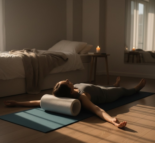 夕暮れ時、または間接照明の優しい光が差し込む部屋で、ストレッチポールの上に仰向けで静かに横たわる人の後姿。両手は体の横にリラックスして置かれ、落ち着いた雰囲気を醸し出しています。