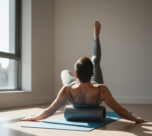 ストレッチポールの上に仰向けに乗った状態で、片方の膝を立てたまま、もう片方の足をゆっくりと床から持ち上げ、体幹でバランスを取っている人の後姿