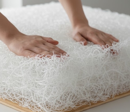 バネのような弾力性: 複雑に絡み合った繊維の一つ一つが、まるで小さなバネのように機能します。体重がかかって圧縮されても、すぐに元の形状に戻ろうとする復元力が非常に高いため、一般的なウレタンやコイルに比べて永続的なへこみ(へたり)が発生しにくいのが最大の特徴です。