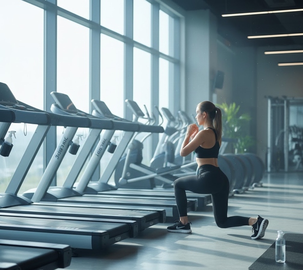 清潔なジム環境でバイクの隣でストレッチをしている画像