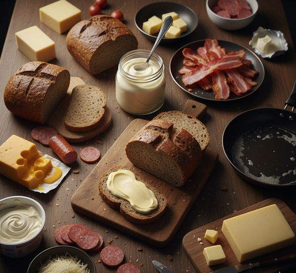 山盛りのマヨネーズや高カロリーなソーセージ、チーズなどが散らばっている画像