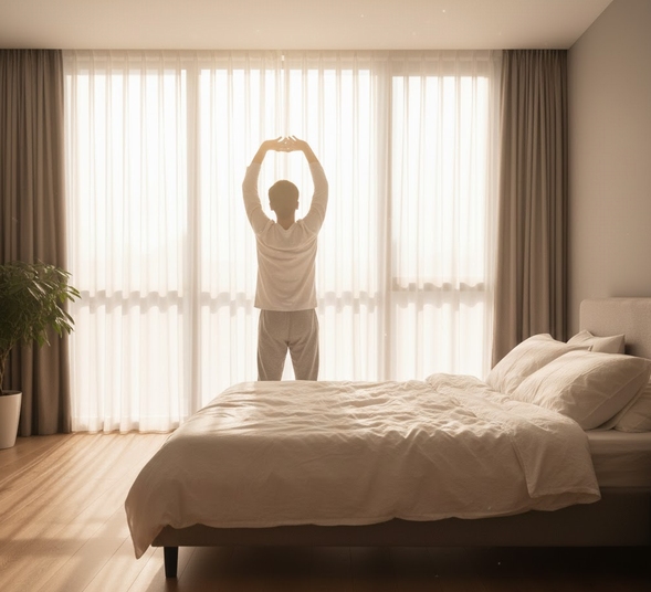 広々とした寝室で、窓から差し込む明るい朝日を浴びながら、ベッドサイドで軽く伸びをしている人物の後ろ姿
