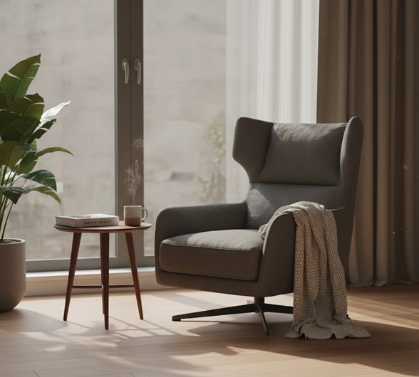 明るく整理された、モダンな書斎の一角。大きな窓からは穏やかな自然光が差し込んでいる画像