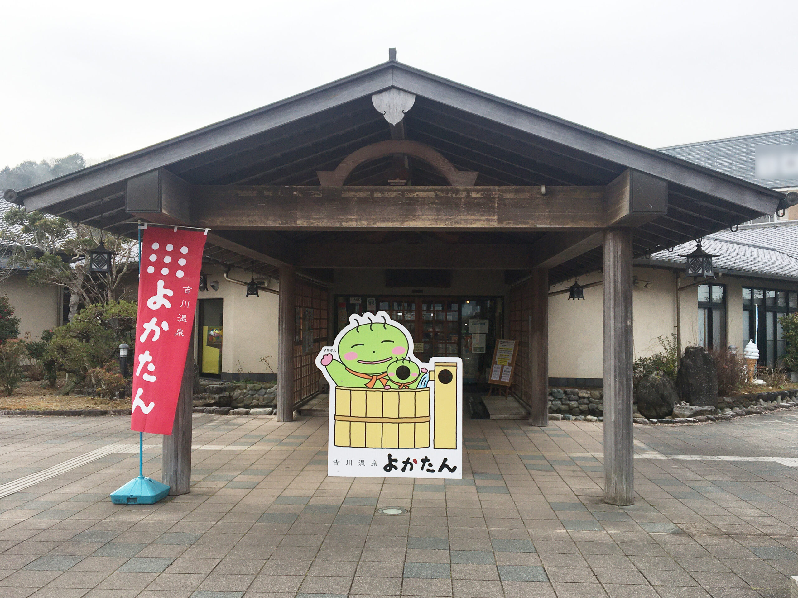 よかたん温泉(吉川温泉)の看板と赤色に「よかたん」ののばりが設置されたエントランス