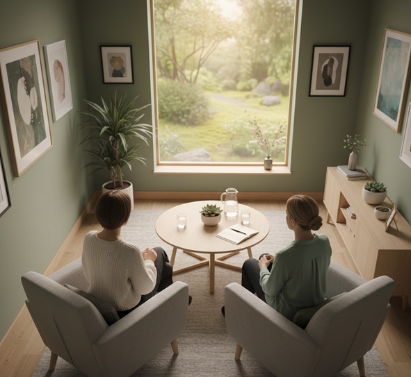 室内でカウンセリングを受けている様子