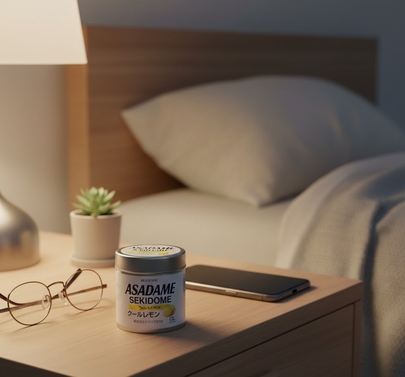 夜、少し暗めの部屋の枕元に、スマートフォン(画面はオフ)、メガネ、そして浅田飴せきどめの缶が置いてある画像