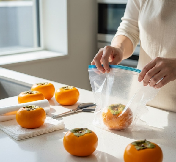 - ジッパー付き保存袋で密封する:ラップで包んだ渋柿を、ジッパー付きの保存袋に入れます。入れたら、袋の中の空気をできる限り抜いて密封します。空気を抜くことで、酸化の進行を遅らせ、渋柿の鮮度と風味を守ります。