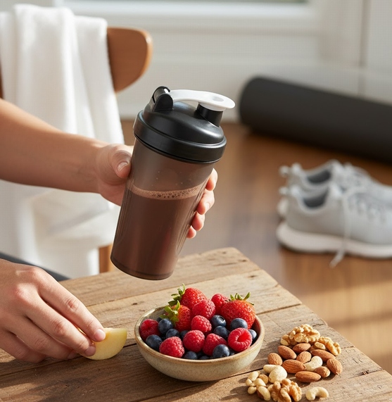 レーニングを終えた後に、リカバリーのためにプロテインドリンクやヘルシーなスナックを摂取しているイメージ