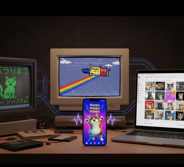 古いブラウン管テレビやレトロなPCモニターが並べられた薄暗い空間、時代を象徴するような猫の表現