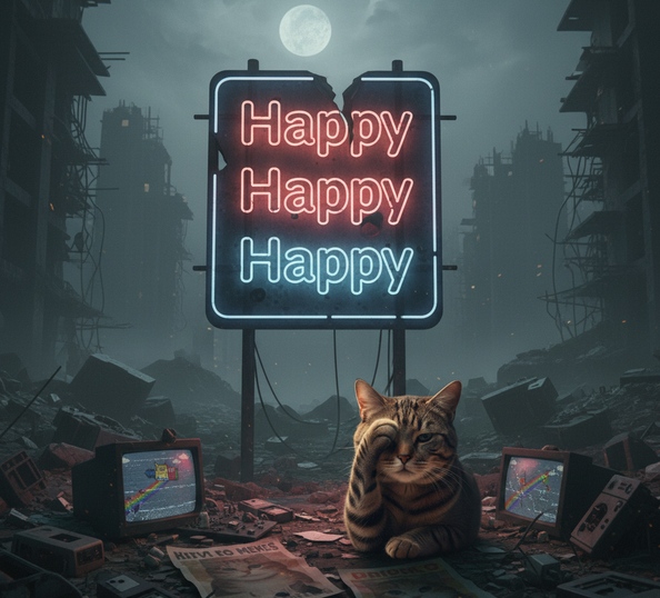 瓦礫や壊れたスクリーンが散らばる廃墟のような空間。その中央に、かつては輝いていたであろう巨大な「Happy Happy Happy」と書かれたネオンサイン