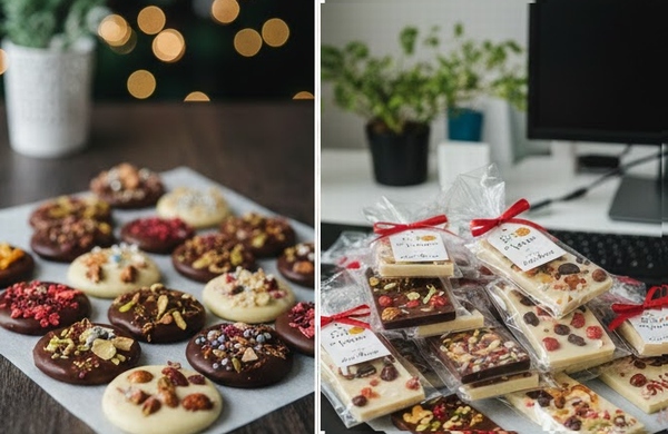 • 板チョコ溶かすだけの定番(マンディアン):クッキングシートの上に溶かしたチョコをスプーンで円形に落とし、固まる前にナッツやドライフルーツを乗せるだけ。驚くほど高見えします。