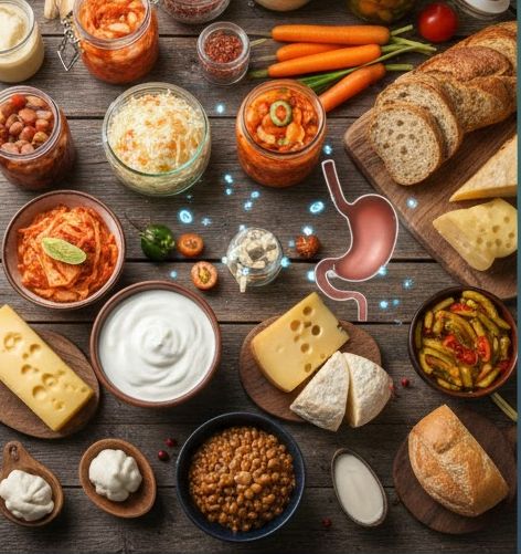 テーブルの上に並んだ発酵食品と胃腸の画像