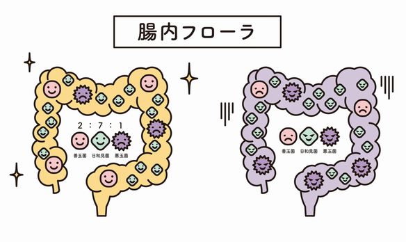 健康的な腸内では、これらの菌が**「善玉菌 2:悪玉菌 1:日和見菌 7」**の比率で維持されているのが理想的だと言われています。