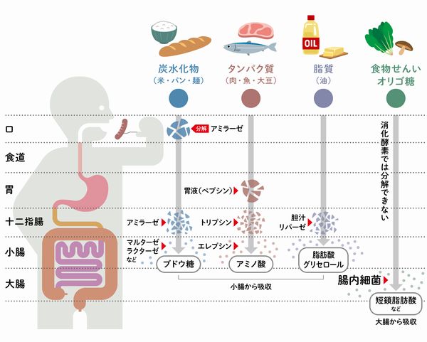 食品がそれぞれどこで吸収されるかを示したがイラスト
