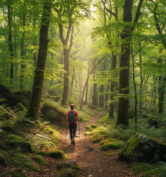 ウォーキングが自然の中で心身をリフレッシュさせる様子を表現しました。緑豊かな森林の中の小道を、ハイキングを楽しむ人の後ろ姿