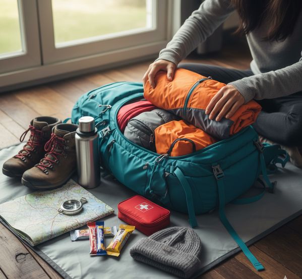 「準備のコツと季節ごとの注意点」や「リュック収納術」のセクションに合う、パッキング中の画像